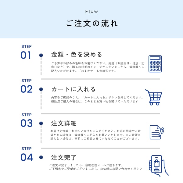 ご注文後、新鮮なお花を仕入れてからアレンジメントしますので最短5日後〜7日後の発送となります。出来る限り午前中発送を心掛けておりますが、場合によっては午後発送となる場合がございます。配送希望日/時間指定はご希望に添えない場合がございますので、何卒ご理解賜りますようお願い申し上げます。